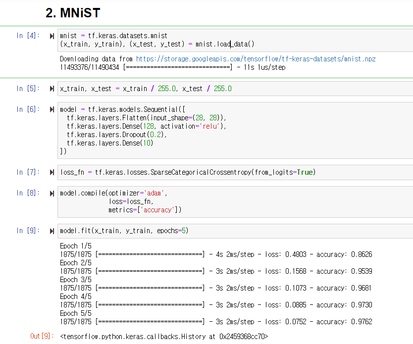 참고로 구동 확인하는 코드도 첨부하겠습니다. MNIST 기본 예제 데이터로 확인했습니다.